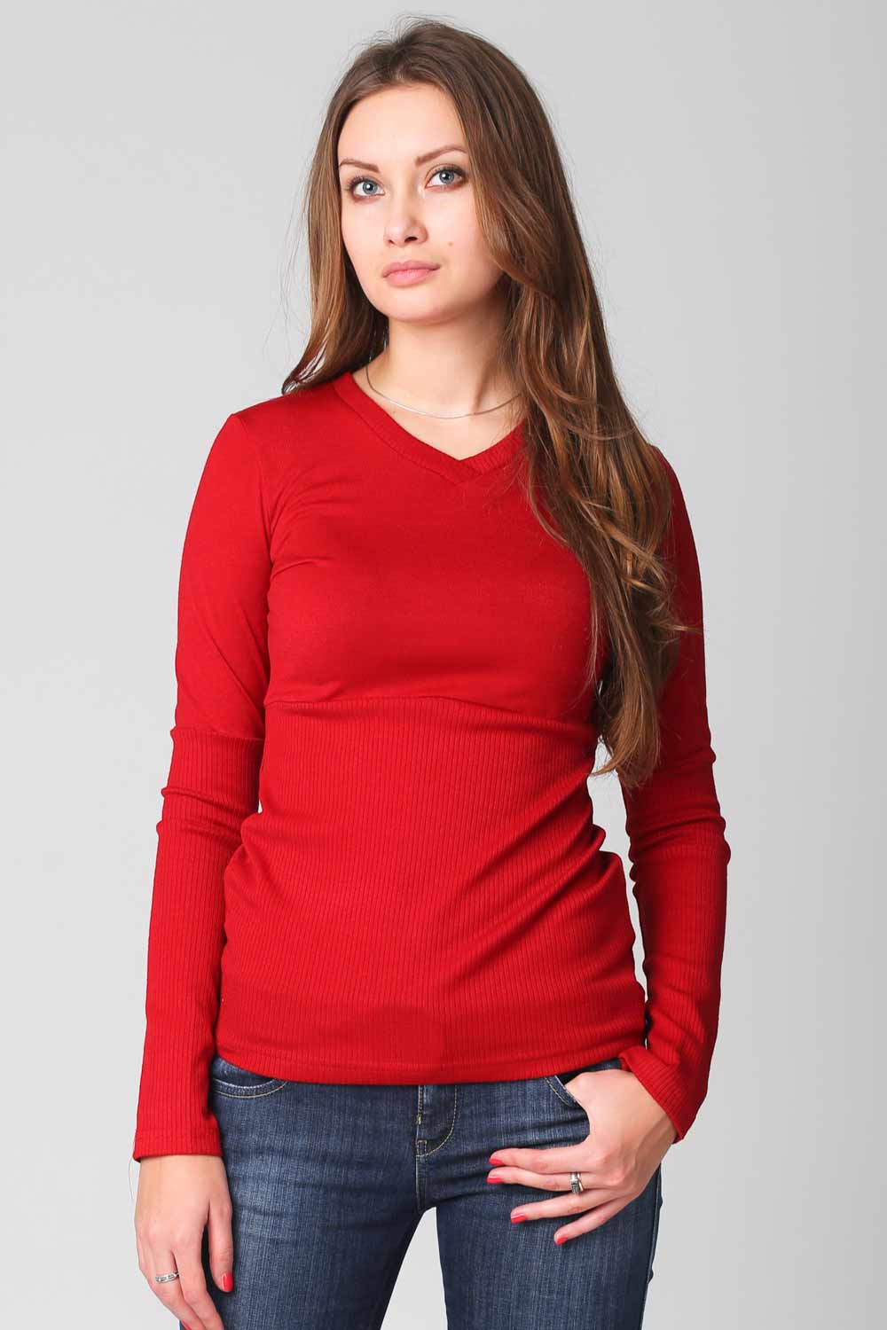 Модный свитер из комбинированного трикотажа гладкого и "в рубчик" прилегающего силуэта. V-образный вырез. Такой свитер - обязательный атрибут вашего гардероба.