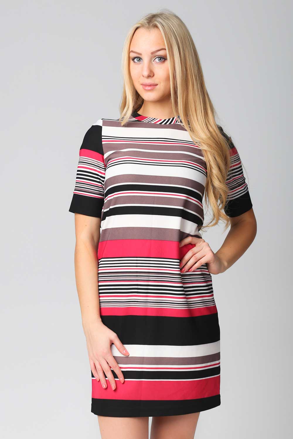 Платье из плотного трикотажа с модным принтом в цветную полоску трапецевидного силуэта.