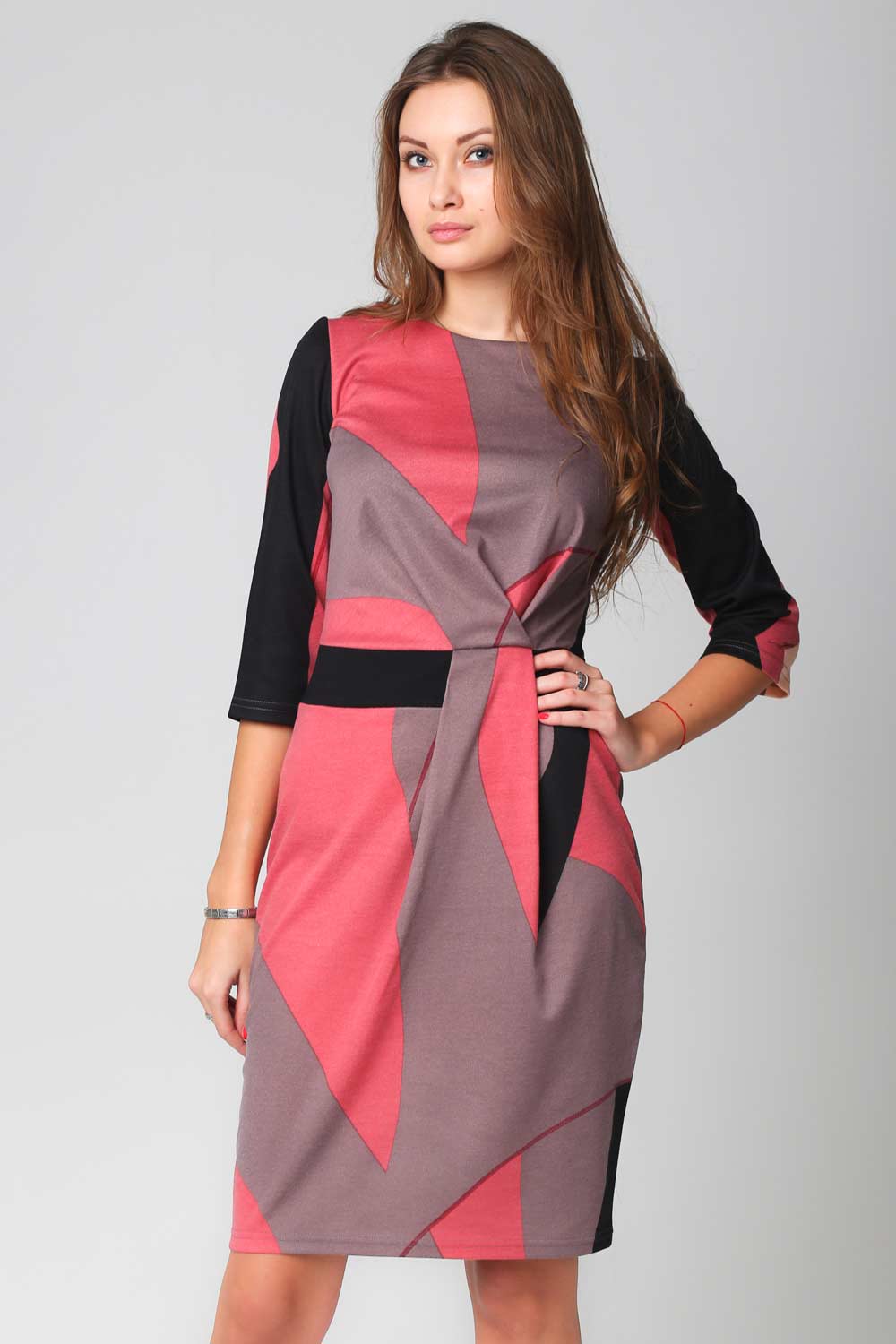 Платье из плотного "французского" трикотажа с прилегающим верхом и полуприлегающим низом с модельным узлом. Талия подчеркнута темным поясом. Геометрический принт в сочетании нескольких цветов, актуален в этом сезоне.