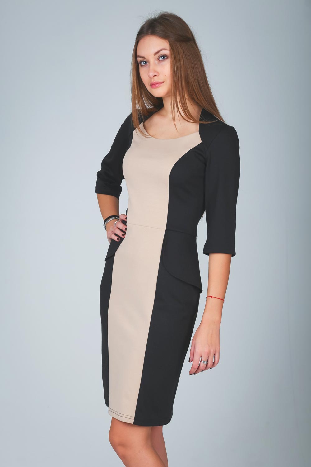 Женственное, элегантное платье из "французского" трикотажа, прилегающего силуэта на молнии сзади в сочетании двух цветов. 3/4 рукав свободного прилегания и модной в этом сезоне "баски".