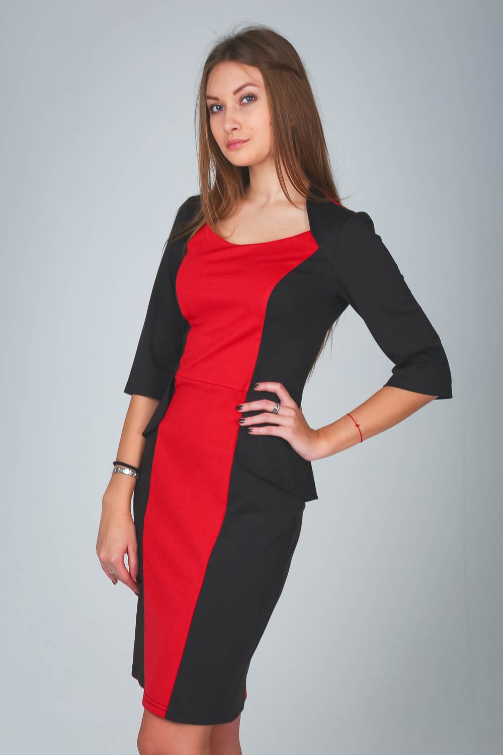Женственное, элегантное платье из "французского" трикотажа, прилегающего силуэта на молнии сзади в сочетании двух цветов. 3/4 рукав свободного прилегания и модной в этом сезоне "баски".