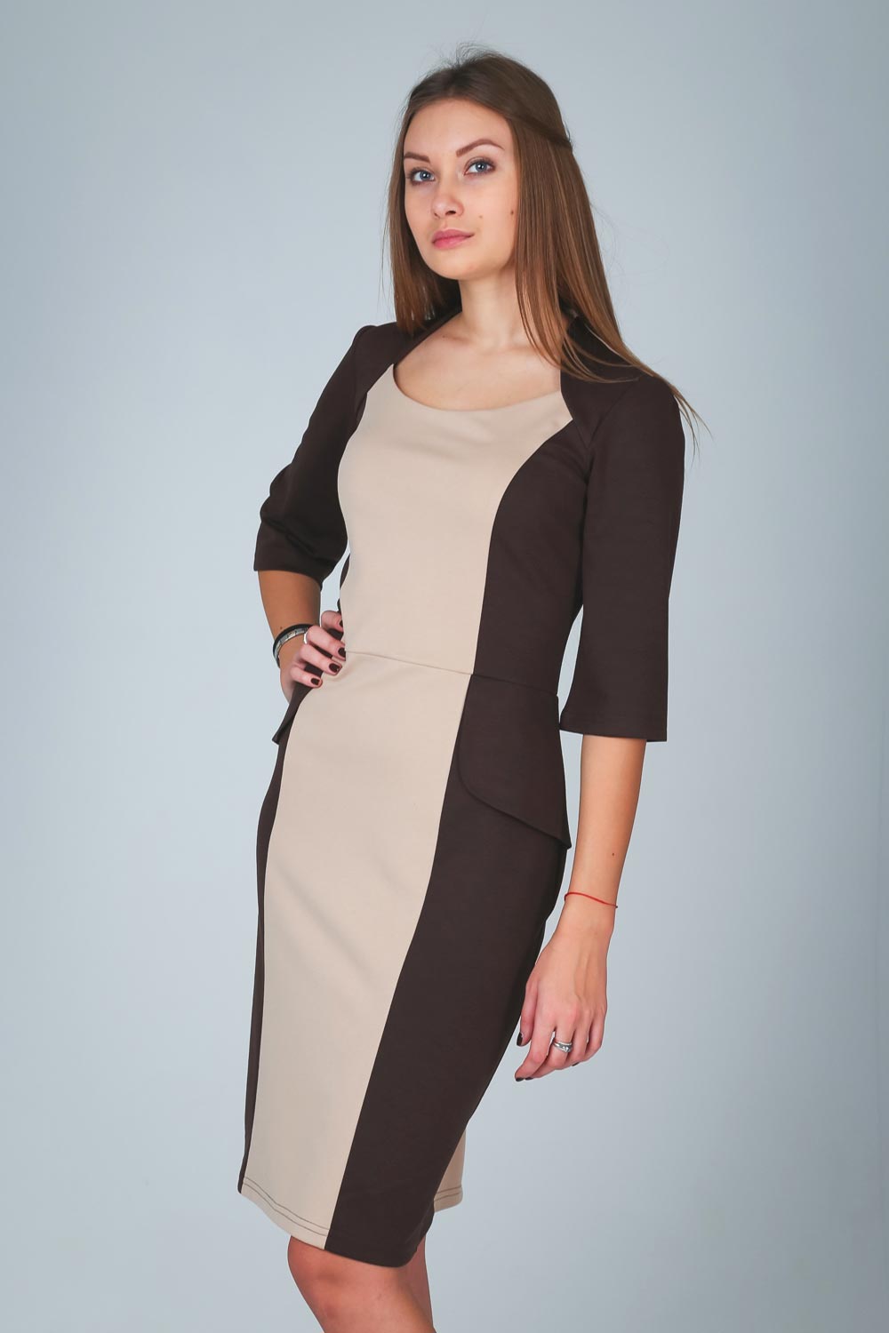 Женственное, элегантное платье из "французского" трикотажа, прилегающего силуэта на молнии сзади в сочетании двух цветов. 3/4 рукав свободного прилегания и модной в этом сезоне "баски".